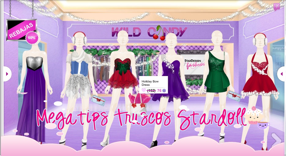 Buen día chicas, stardoll nos ha enviado un mensaje, informándonos de que ya están las rebajas del mes y éstas corresponden a la tienda Wild Candy. Solo el primer nivel de la tienda contiene rebajas del 50% porque ellos especifican que solo la colección Holiday estará rebajada.